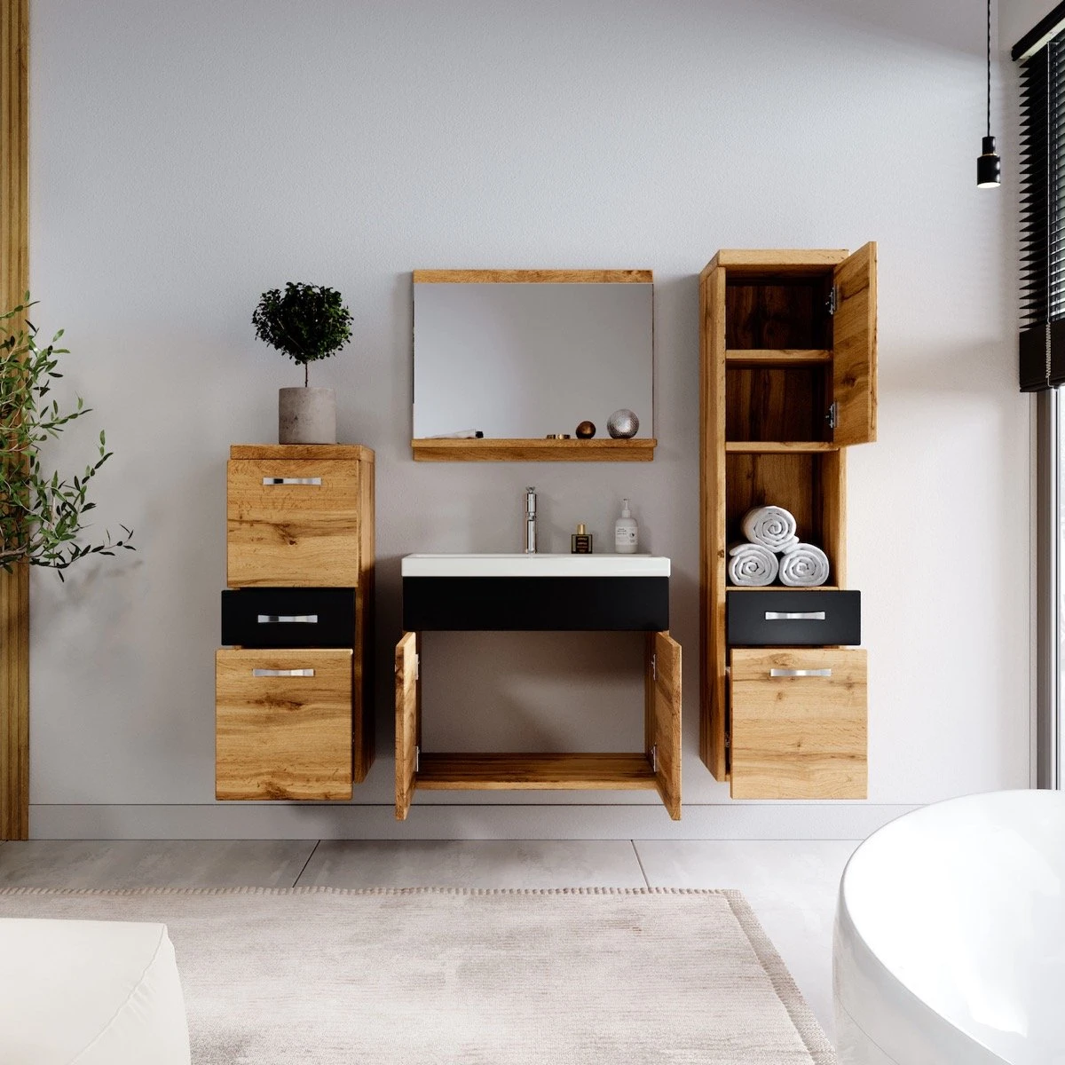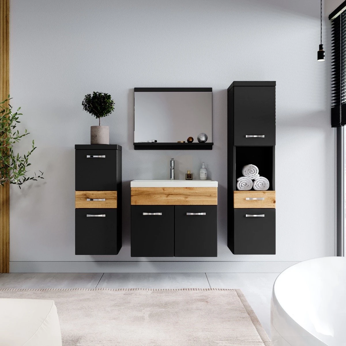 Badkamermeubelset Alba inclusief spiegel en twee kolomkasten, uitgevoerd in zwart me eiken. Wastafel van kunstmarmer 60cm breed, 35cm diep. Eenvoudig te monteren. Afmetingen badmeubel: 60 x 35 x 51cm