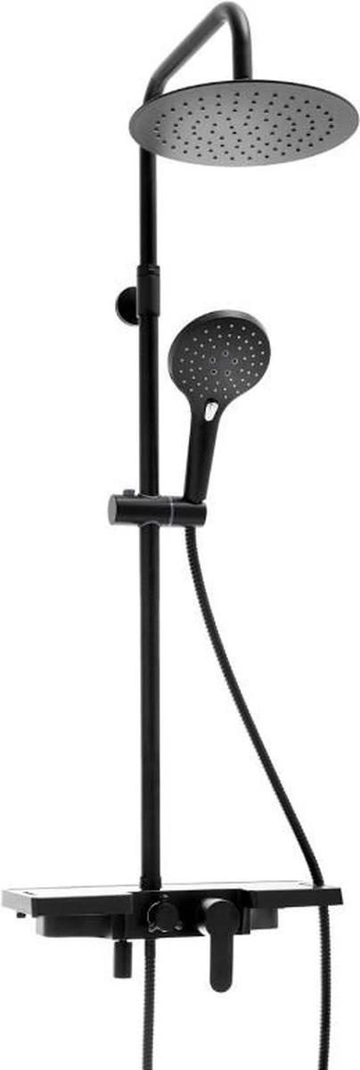 De set bevat een douchemengkraan met temperatuurmengkraan, watervolume aanpassing en een waterstroomschakelaar tussen de regendouche en de handdouche. Daarnaast is de doucheset voorzien van een brede plank voor handige accessoires, waaraan een kraan en uitloop zijn bevestigd. Het plank oppervlak is mat zwart van kleur. De keramische kop van de kraan (35 mm) garandeert duurzaamheid en sterkte. De doucheset bevat een stijlvolle regendouche met een diameter van 25 cm en een en een handdouche die is uitgerust met twee waterstraalstanden welke met een knop op het handvat kunnen worden veranderd – beide met een modern ANTI-CALC-systeem.