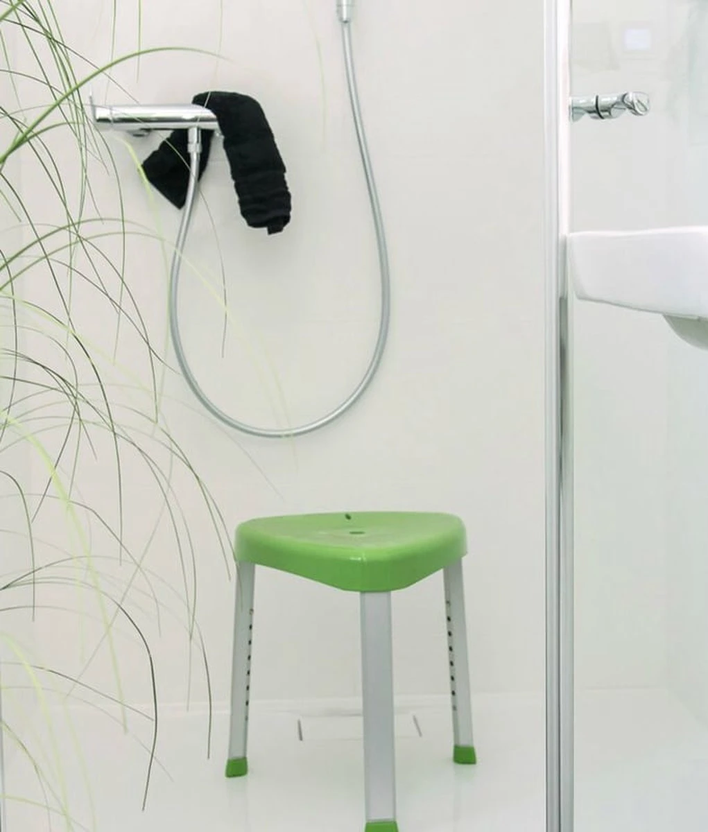 Hoek douchekruk met een mooi design die in hoogte verstelbaar is van 45 cm tot 56 cm, zo kunt u de juiste zithoogte zelf bepalen. Door de vorm van het douchekrukje past deze perfect in de hoek van een douche en neemt daardoor bijzonder weinig ruimte in.