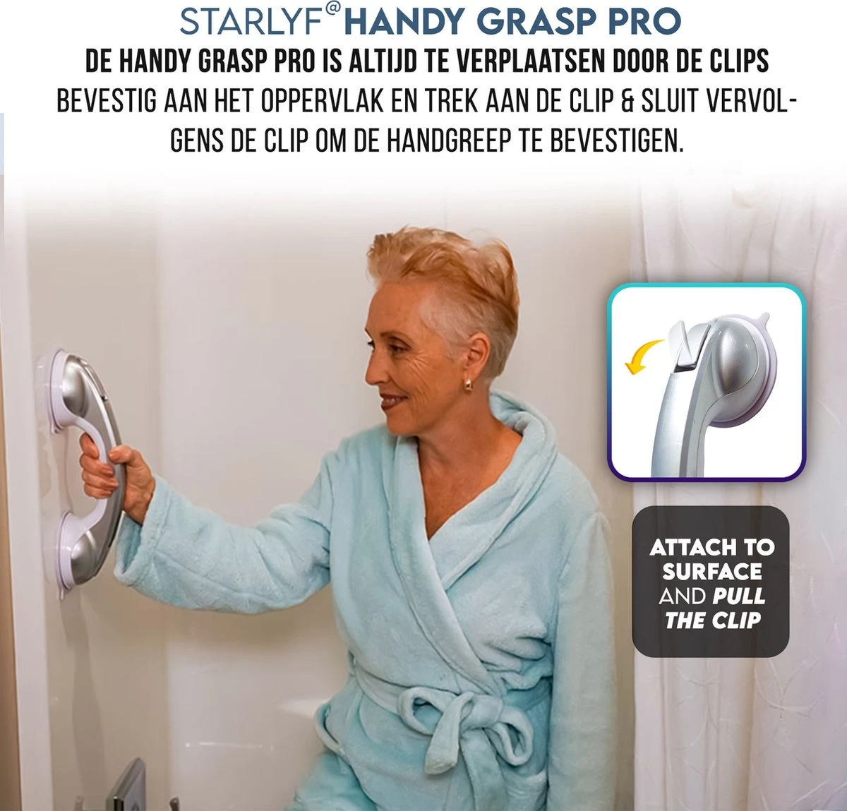 De Handy Grasp Pro is bedoeld om mensen te ondersteunen bij natuurlijke bewegingen, denk hierbij aan het verlaten van de douche. De handgreep is in enkele seconden makkelijk te bevestigen op de door uw gewenste plek. De Handy Grasp Pro is extra lang, namelijk 30,5 cm zodat u zich goed vast kan houden.