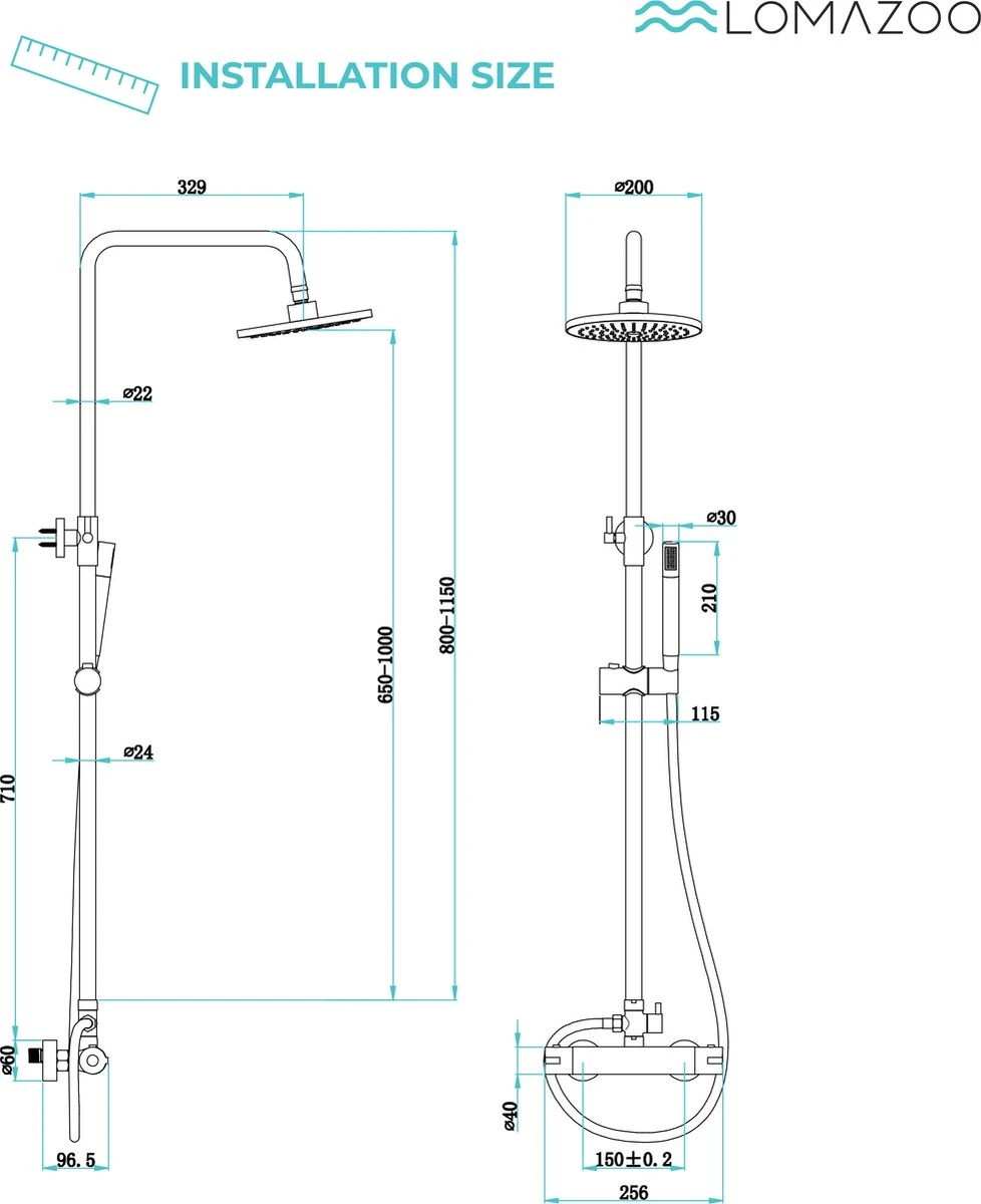 - Hoogte regendouche: 800-1150 mm (in hoogte verstelbaar)