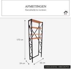 Homestic© – Ruimtebesparende Toiletmeubel – WC Plank, Badkamerplank Met 4 Open Vakken – Industrieel RVS Badkamermeubel – Zwart Staal / Hout – 170x54x24 CM
