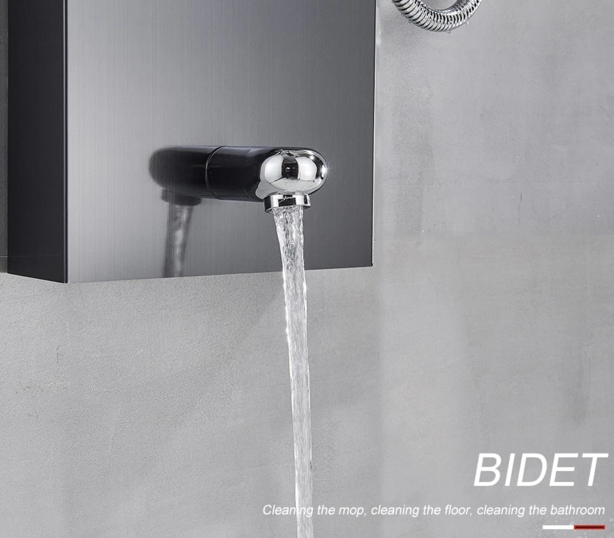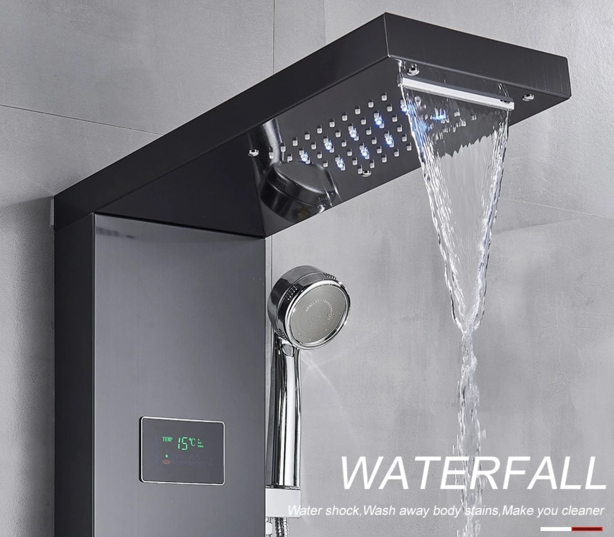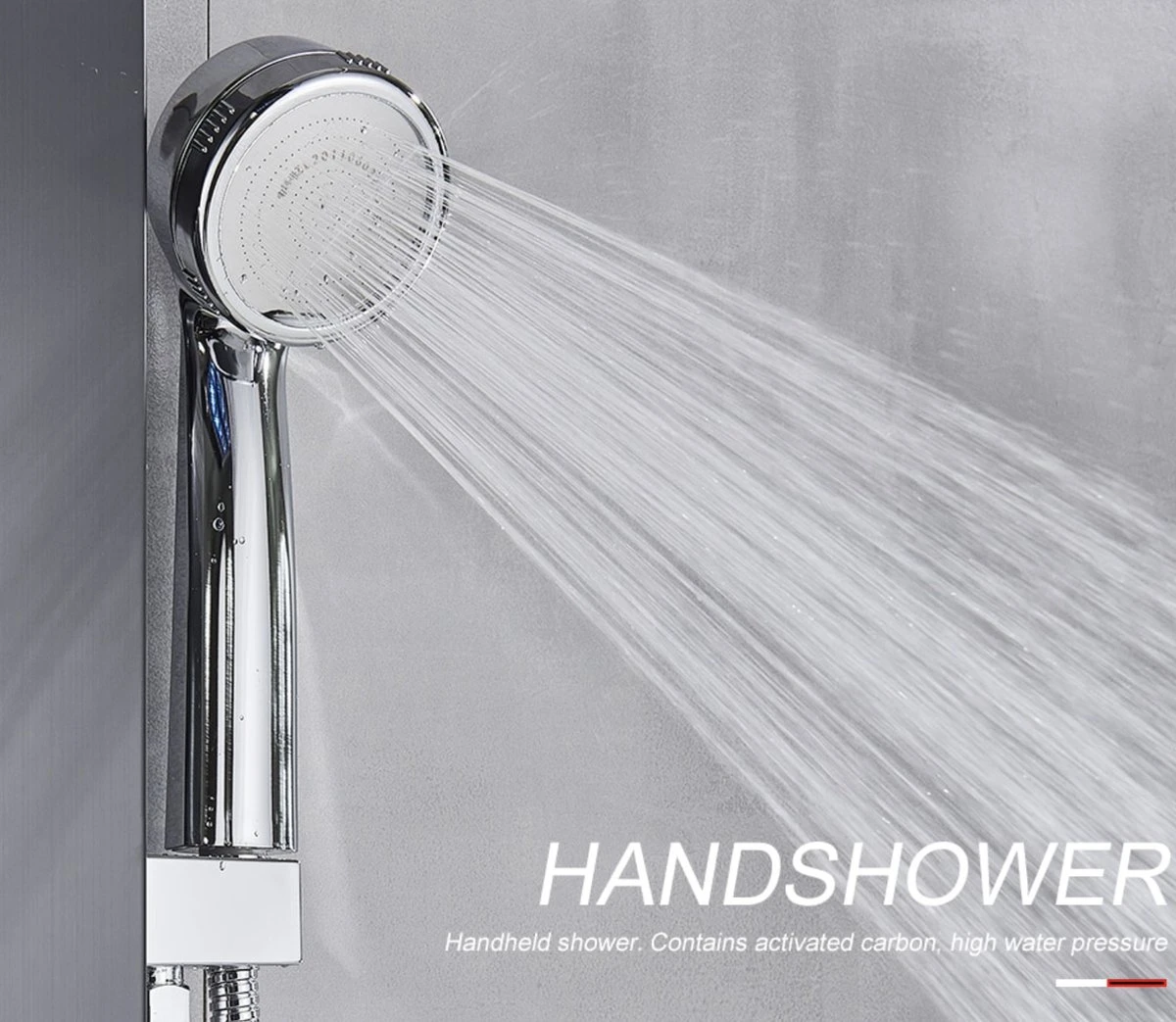 β 5-in-1 Douchesysteem – Met dit douchepaneel heb je keuze uit 5 comfortabele douche modi: waterval, regenval, twee massagestralen, een handdouche en een onderkraan.