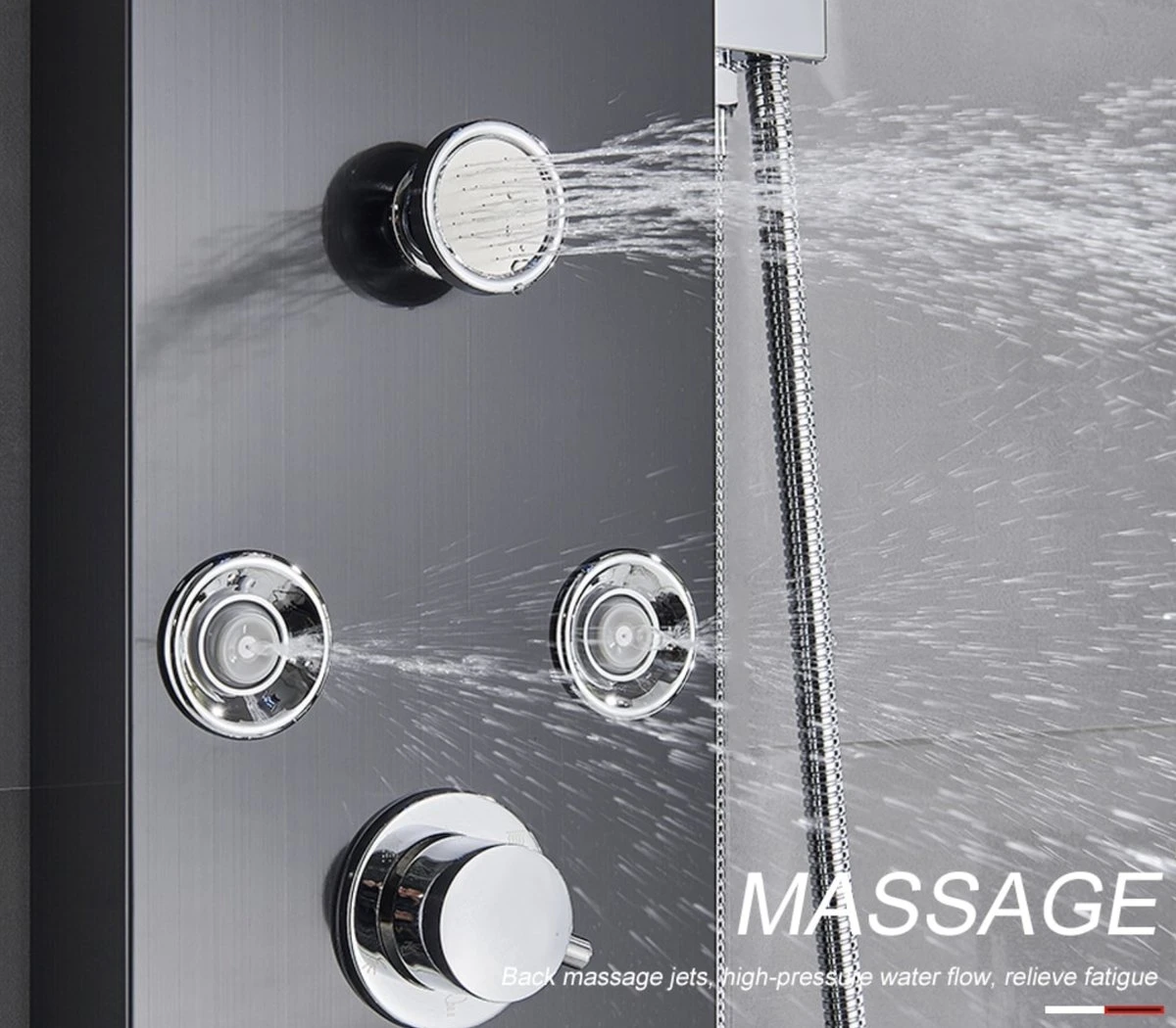 Ontspan lichaam en geest. Met dit douchepaneel is huis kun je niet alleen genieten van een comfortabele douche-ervaring, hij voorziet jou ook van heerlijke massages! De douche heeft 5 verschillende waterstraal-modi: waterval, regenval, twee massagestralen, een handdouche en een onderkraan. Maak in elke situatie gebruik van de meest comfortabele waterstraal.