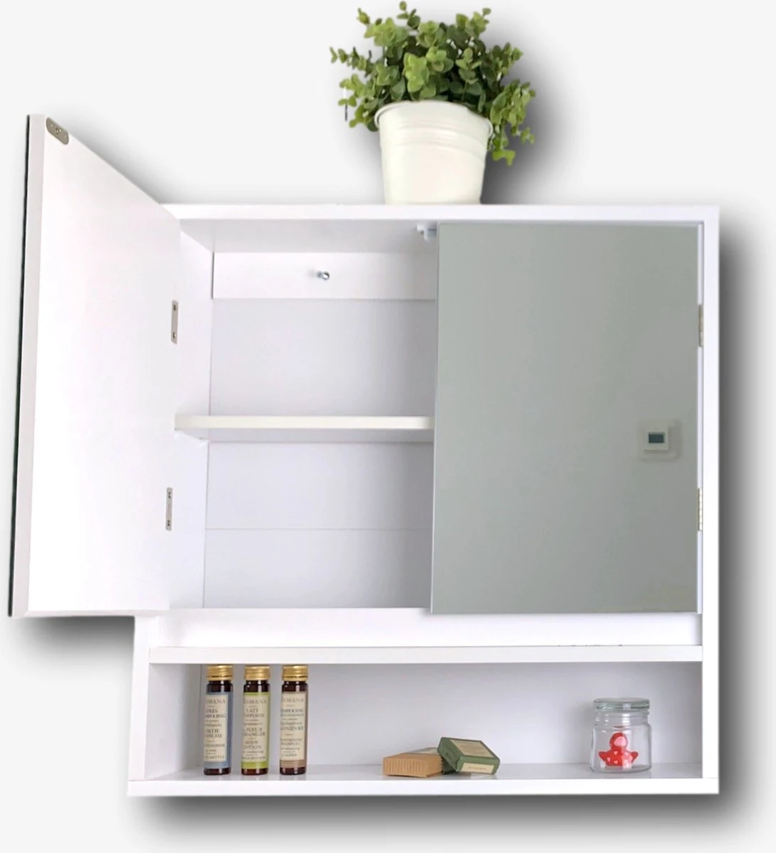 Deze stijlvolle spiegelkast is een tijdloze keuze voor in je compacte badkamer. De witte badkamerkast heeft een tijdloze elegantie en past in elke woonstijl. Op de 2 schappen achter de spiegeldeuren kun je je cosmetica en medicijnen gemakkelijk uit het zicht opbergen. Het onderste zichtbare compartiment is ideaal voor decoratieve items.