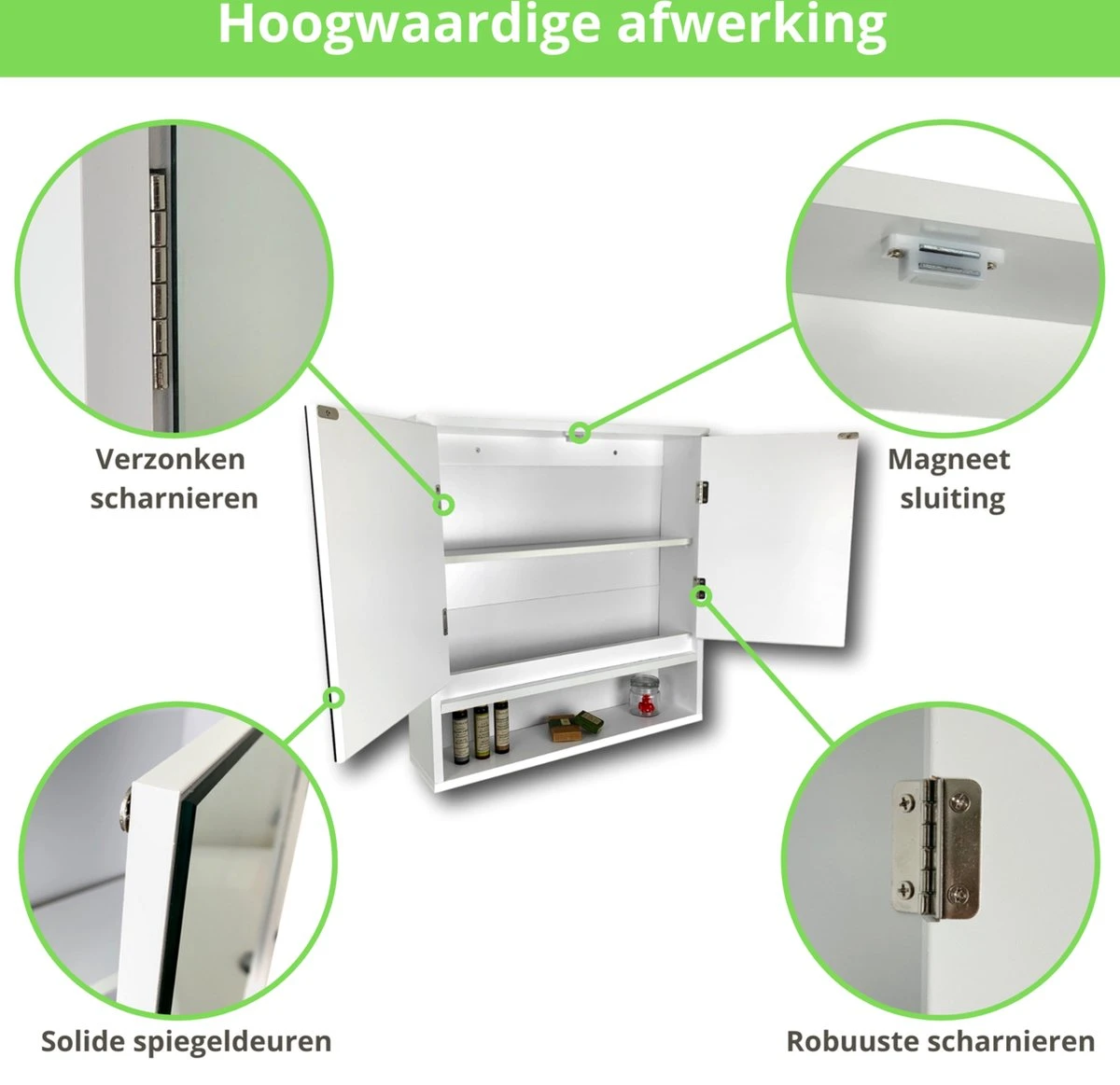 Deze spiegelkast is gemaakt van hoogwaardig gelamineerd hout en is vochtbestendig. De solide spiegeldeuren zijn voorzien van stevige metalen scharnieren die van buitenaf gezien stijlvol verzonken liggen. De deuren sluiten tegen een magneetsluiting waardoor ze goed gesloten blijven en de bediening solide aanvoelt.